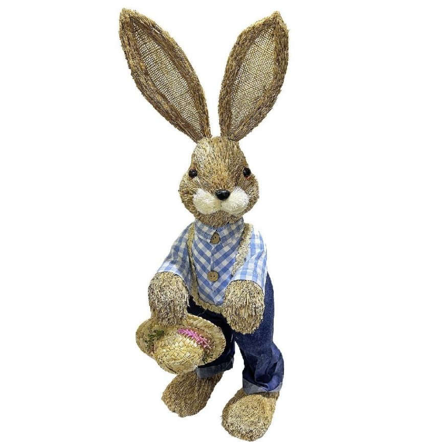 73-2159 Λαγός Όρθιος Μπλε Πουκάμισο Ψάθινος Κρατάει Καπέλο 60x21x20cm