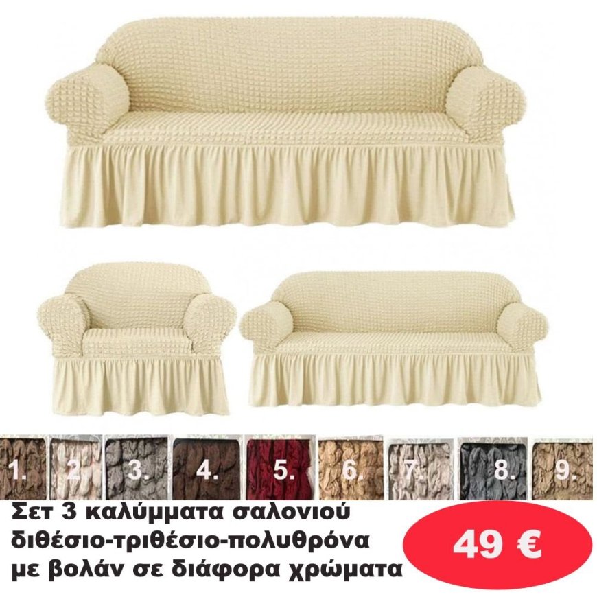 ΣΕΤ 3 Καλύμματα Σαλονιού Διθέσιο-τριθέσιο-πολυθρόνα με βολάν σε διάφορα χρώματα