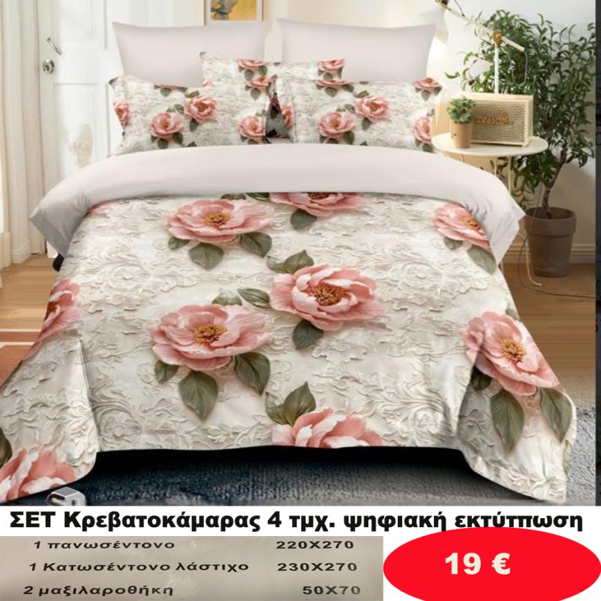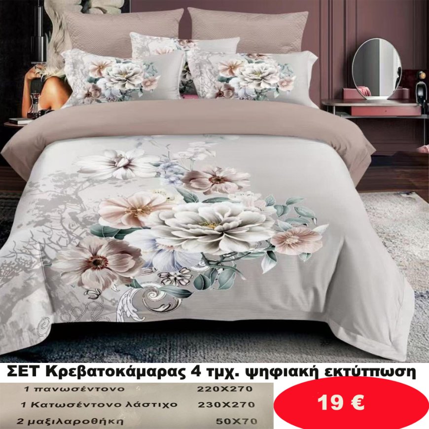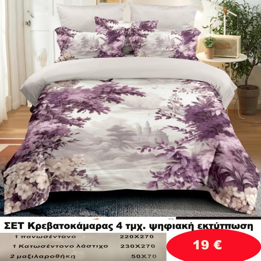 Σετ κρεβατοκάμαρας υπέρδιπλα 4 τμχ. με ψηφιακή εκτύπωση-1 κατωσέντονο με λάστιχο 230Χ270-1 πανωσέντονο 220Χ270 και 2 μαξιλαροθήκες 50Χ70 σε διάφορα χρώματα