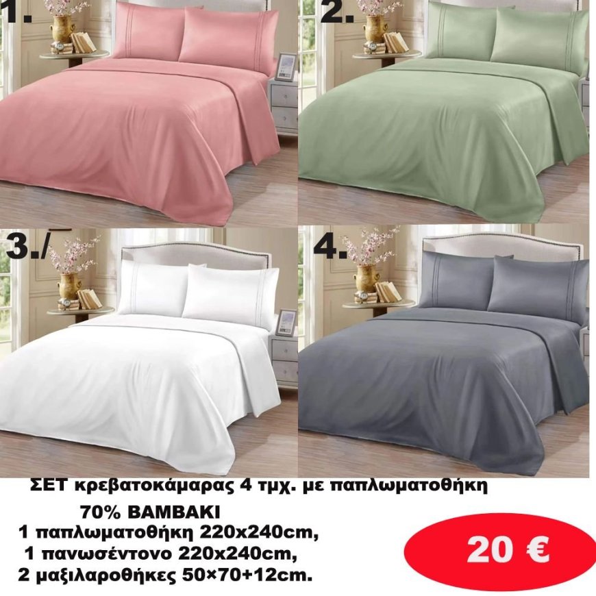 ΣΕΤ Σεντόνια ΥΠΕΡΔΙΠΛΑ 4 τμχ. 70 ΒΑΜΒΑΚΙ ΜΕ ΠΑΠΛΩΜΑΤΟΘΗΚΗ -1 παπλωματοθήκη-1 πανωσέντονο -και 2 μαξιλαροθήκες σε διάφορα χρώματα
