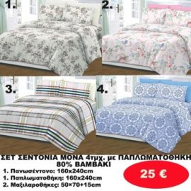 ΣΕΤ Σεντόνια ΜΟΝΑ 4 τμχ. 80 ΒΑΜΒΑΚΙ ΜΕ ΠΑΠΛΩΜΑΤΟΘΗΚΗ -1 παπλωματοθήκη-1 πανωσέντονο -και 2 μαξιλαροθήκες σε διάφορα χρώματα